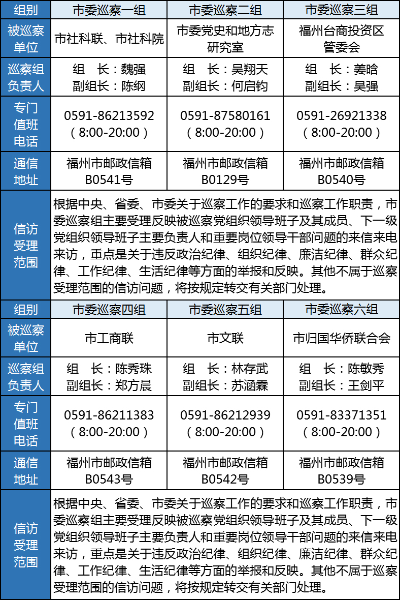 根据《中国共产党巡视工作条例》及中央、省委和市委关于巡察工作的部署要求,经市委巡察工作领导小组同意,从2020年7月下旬开始,十一届福州市委第九轮第二批巡察工作展开,市委巡察组对市社科联、市社科院、市委党史和地方志研究室、福州台商投资区管委会、市工商联、市文联、市归国华侨联合会等7家单位党组织(市社科联、市社科院合并巡察)开展巡察,巡察时间30天(市社科联、市社科院合并巡察)。